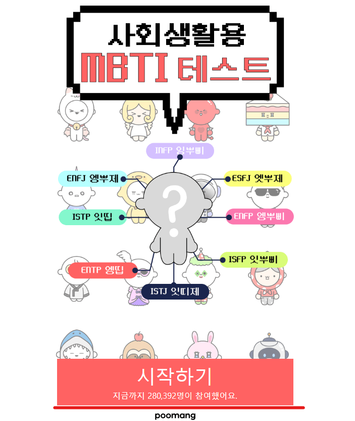 ▼ 최근 푸망에서 새롭게 출시된 사회생활용 MBTI 테스트는 인기가 치솟고 있습니다.